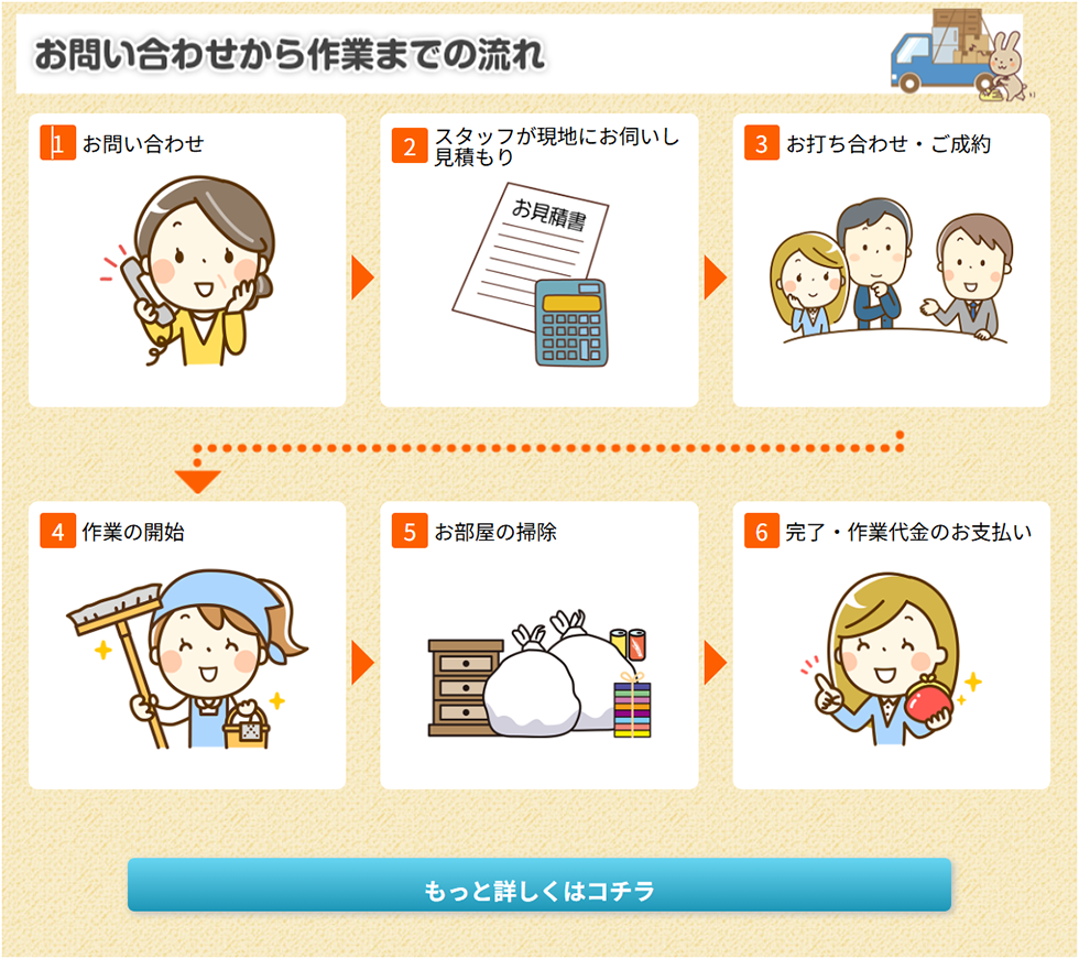 相談内容 引越し前後の不用品処分・引き取り処分, ゴミ屋敷や空き家の片付け, オフィスの片付け, ガレージや倉庫の整理・不要品買取, 整理収納コンサルティング